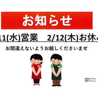 令和8年2月11日(水)は営業し、2月12日(木)をお休みいたします。