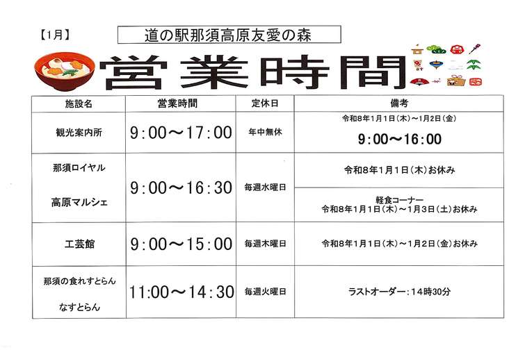道の駅那須高原友愛の森営業時間・定休日についてお知らせ