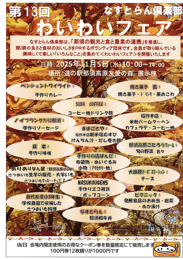 なすとらん倶楽部による第13回わいわいフェア 名前の通り那須の観光と「食と農業の連携を推進し那須の良さと食材のおいしさをPRするボランティア団体です。会員が取り組んでいる美味しく楽しい「いろんなこと」を集めてわいわいフェアを開催 日時 2025年11月5日(水)10時~14時 場所 道の駅那須高原友愛の森展示棟 ぜひ、遊びに来てください。