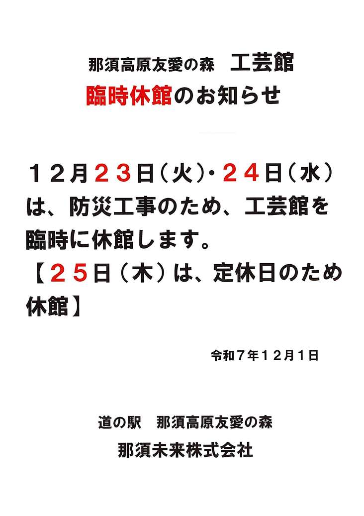道の駅那須高原友愛の森工芸館よりお知らせ 12月23日(火)~24日(水)は防災工事のため、工芸館を臨時休館にします。 なお、25日(木)は定休日となります。 ご迷惑をお掛けいたしますが、ご理解ご協力をお願いします。
