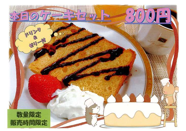 内容 シフォンケーキ・ゼリー・ドリンク付 800円