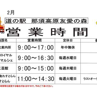 令和8年2月道の駅那須高原友愛の森営業時間について