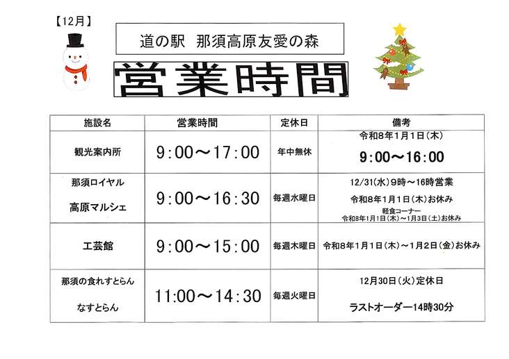 道の駅那須高原友愛の森営業時間・定休日についてお知らせ
