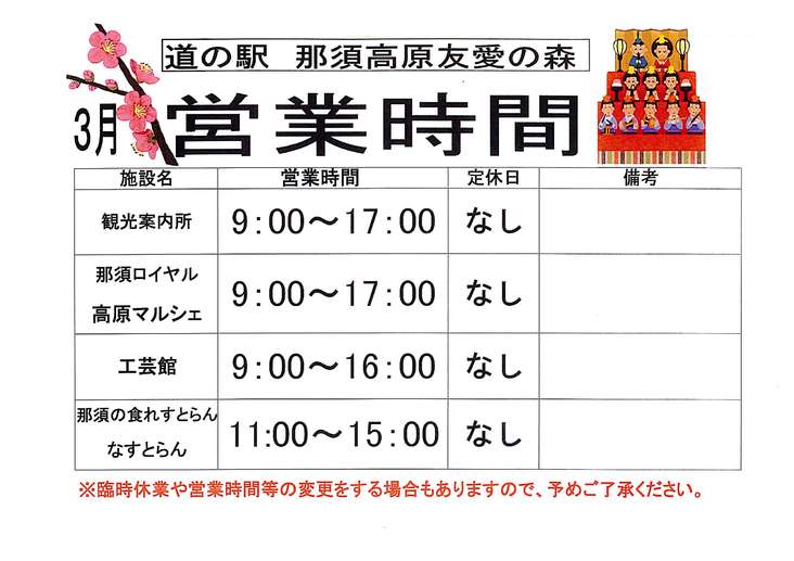 つきましては、3/1(日)より下記内容で各施設営業しますので、ご確認ください。